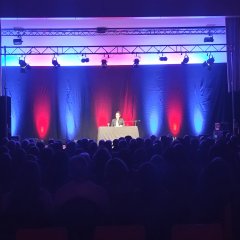 Nach dem literarischen Tagesplan warteten die vielen Interessierten auf den Sonntagabend. Kabarettist Rüdiger Hoffmann aus Bonn hatte sich angekündigt. Innerhalb kürzester Zeit waren 400 Tickets im Vorverkauf vergriffen. Rüdiger Hoffmann als einer der Stand-Up-Pioniere der bundesdeutschen TV-Landschaft bediente alle Erwartungen seiner Fans.