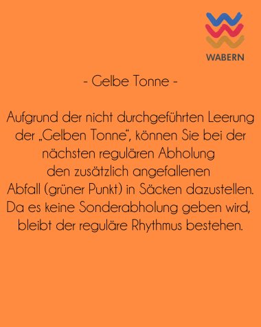 Die Abfuhr der Gelben Tonne konnte in Teilbereichen von Wabern sowie im OT Hebel nicht erfolgen. Da von Seiten des Abfuhrunternehmens keine Sonderfahrt möglich ist, werden die Gelben Tonnen im regulären Rhythmus geleert (nächster Termin: 09.02.2026). Zusätzlich anfallender Müll (grüner Punkt) kann dann in handelsüblichen Abfallsäcken zu der Gelben Tonne gestellt werden.