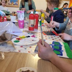 Der Kreativtag fand am Donnerstag ausschließlich im Familienzentrum statt. Den Kindern und Jugendlichen war es möglich, sich an verschiedenen Stationen kreativ auszuprobieren. Es konnten Stofftaschen und -mäppchen bemalt werden. Mit Acrylfarbe und Leinwänden, sowie verschiedenen Materialien, wie Fäden, Perlen, Wackelaugen, Papier und mehr, wurden Kunstwerke erschaffen. Das Highlight waren die Anhänger aus Schrumpffolie, bei dem die Kinder selbst Vorlagen gestalten konnten. Begeistert warteten die Kinder vor dem Ofen, in dem die Schrumpffolie sich zusammenzog und ihre Form änderte. Jeder konnte an dem Tag ein kleines Andenken an die Woche mit nach Hause nehmen. Auch an diesem Tag wurden wir durch ein leckeres Mittagessen von der Starthilfe unterstützt.
