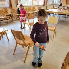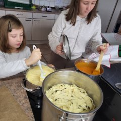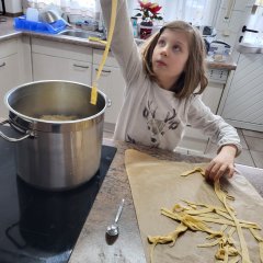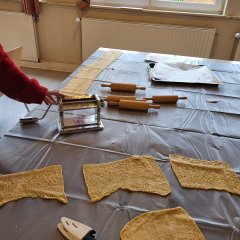Der Mittwoch stand ganz im Thema: Märchen. Zunächst waren wir im Familienzentrum und bereiteten uns bereits inhaltlich auf die Grimm-Welt vor. Die Gruppe startete dazu mit einer Fühlbox und erriet verschiedene Märchen anhand verschiedener Gegenstände. Im Anschluss startete das Märchenkochen zu „Rapunzels Haaren“. In unterschiedlichen Gruppen wurden eine Tomatensoße und eine Käsesoße selbst zubereitet. Ein Teil der Kinder knetete den Teig für die selbstgemachten Nudeln, drehte ihn durch die Nudelmaschinen und schnitt ihn zu. So entstand gemeinsam ein leckeres Mittagessen für alle Teilnehmer, auf das alle sehr stolz waren.