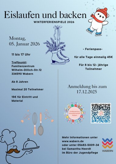 | Inhalt | Wir wollen gemeinsam mit Kennenlernspielen beginnen und im Anschluss zum Eislaufen in die Eishalle Wabern (Wintersportcenter) gehen. Nachmittags wird zusammen gebacken. |