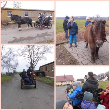 Dort angekommen wurde zunächst einmal am Lagerfeuer gefrühstückt. Der ganze Vormittag stand im Zeichen der tierischen Freunde. Die Kinder konnten einiges über Ponys erfahren und sie dann über das Gelände führen. Zum Ende des Vormittages ging es dann mit der Kutsche zur KiTa zurück. Alle Kinder hatten große Freude an diesem besonderen Erlebnis und berichteten aufgeregt davon. Wir sagen ein riesengroßes „DANKESCHÖN“ an die Organisatoren und die Durchführenden dieses unvergesslichen Events.