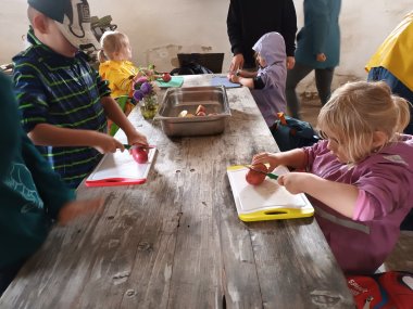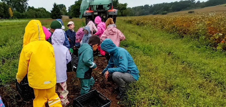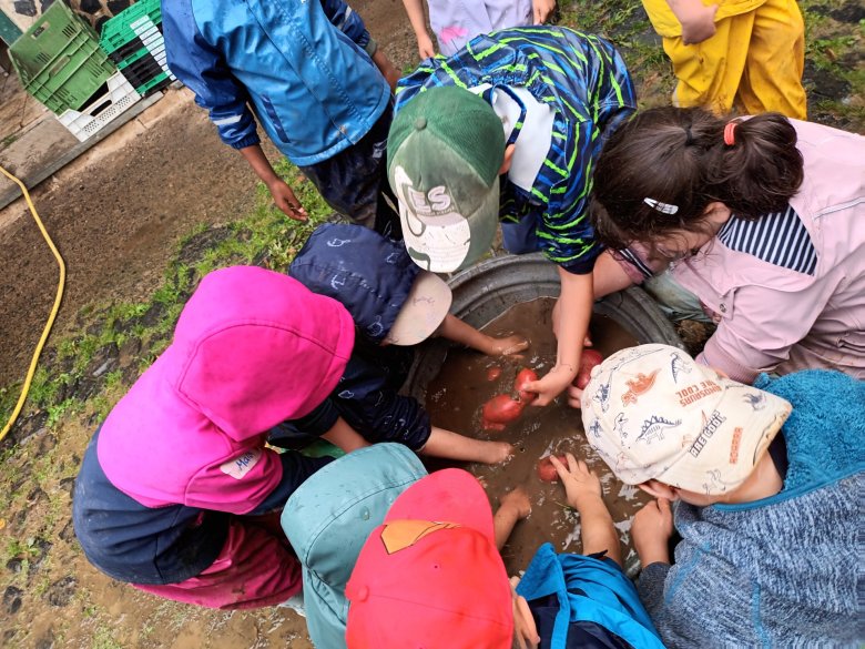 Endlich hat der Regen aufgehört und wir sind gemeinsam über den Hof bis zum Kartoffelacker gelaufen. Ein Teil der Gruppe hat hier die rotschalige Kartoffel „Laura“ aus der Furche gelesen. In der Zwischenzeit war der andere Teil der Gruppe im Gewächshaus und hat Gurken, Tomaten und Kräuter geerntet. Alle diese Zutaten waren für unser Mittagessen bestimmt. Die Kinder haben die Kartoffeln in Wannen gewaschen und anschließend wurde gemeinsam geschnippelt. Die Kartoffeln wurden in den heißen Ofen geschoben. Wir haben die Wartezeit überbrückt, indem wir Möhren geerntet haben. Diese haben wir auch gewaschen und in Scheiben geschnitten. Mit den Kräutern haben wir einen gesunden Kräuterquark gemacht. Nachdem die Kartoffeln fertig gebacken waren, haben wir alles gegessen. Das war wirklich sehr lecker. Zum Schluss sind wir wieder mit dem Bus in die Kita gefahren.