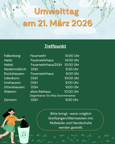seit 2020 ist der Umwelttag fester Bestandteil im Kalender der Gemeinde Wabern. Auch weiterhin gibt es viel Müll zu sammeln – und gute Gründe, sich gemeinsam für Umwelt und Natur einzusetzen.